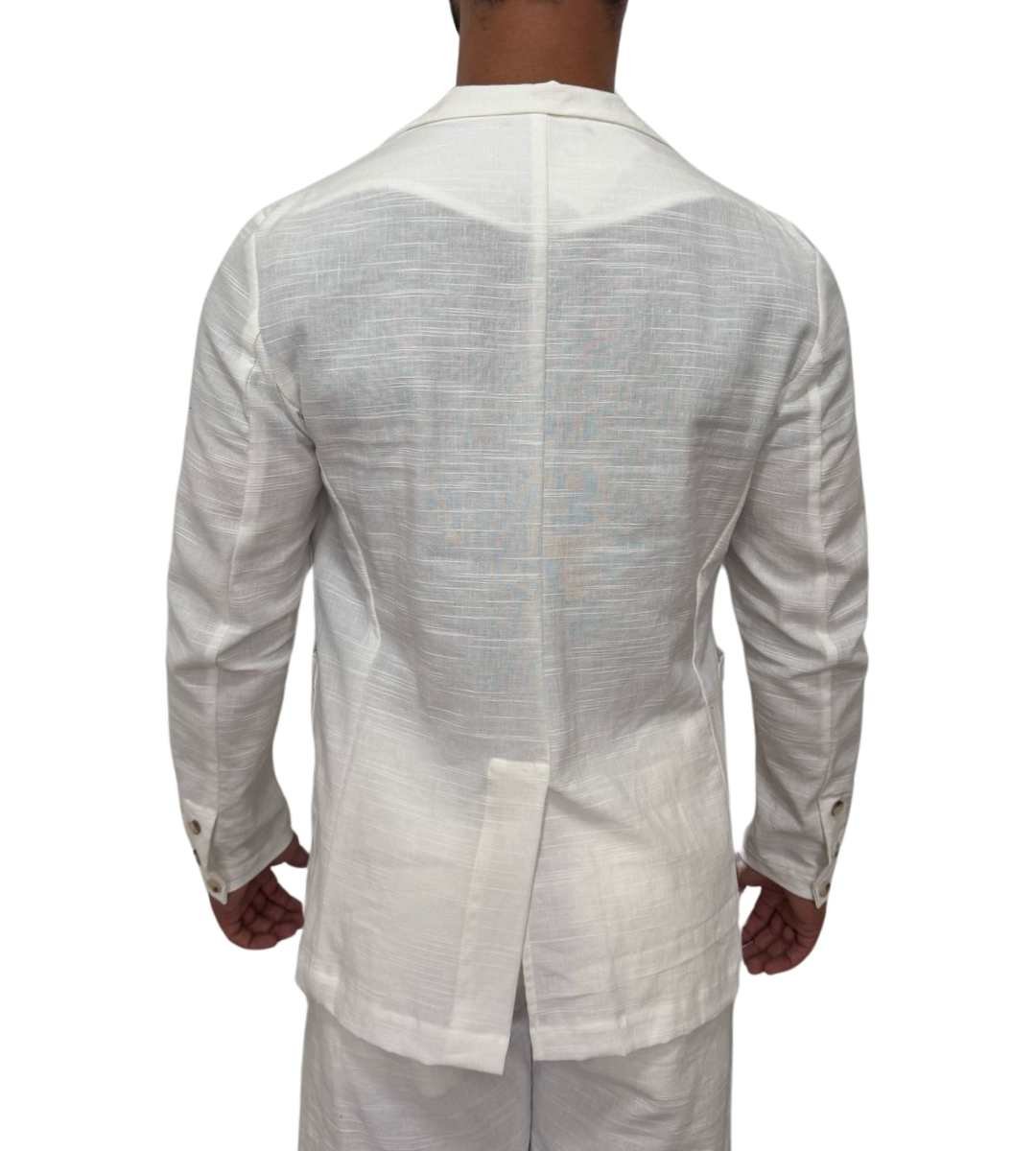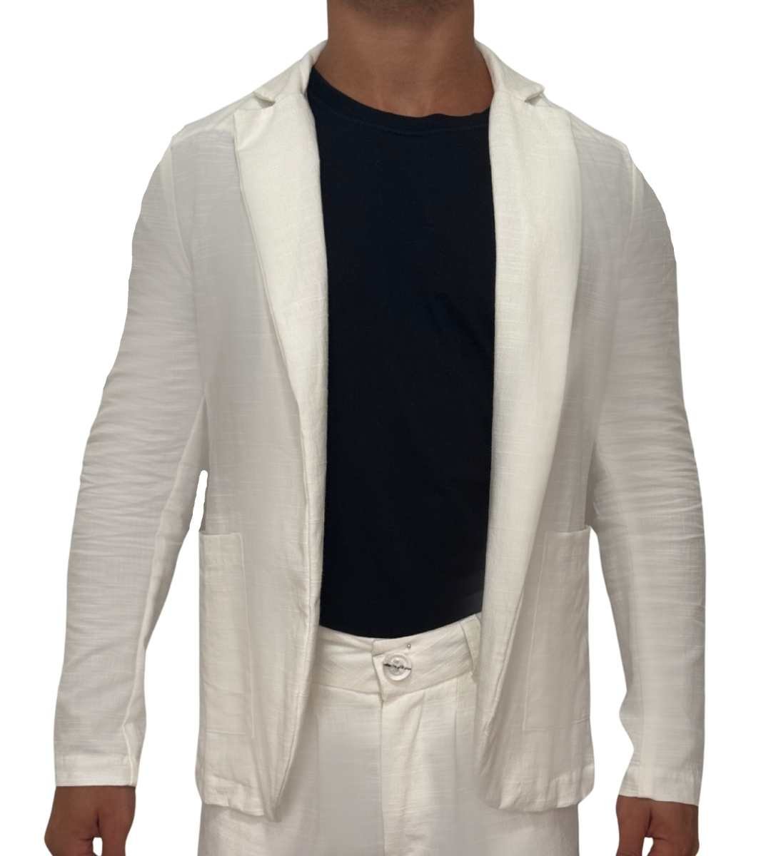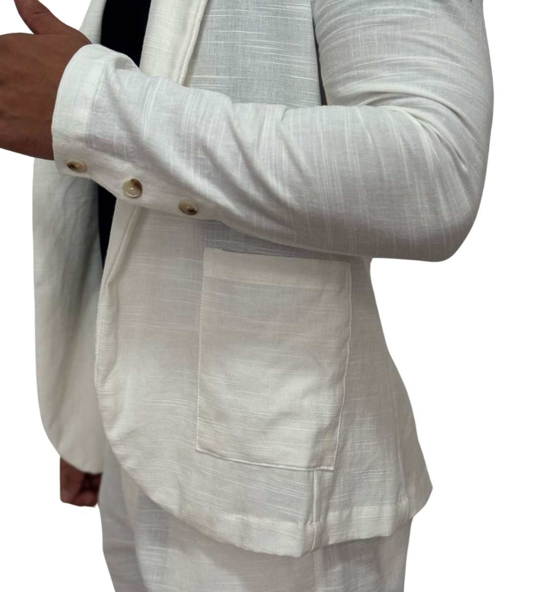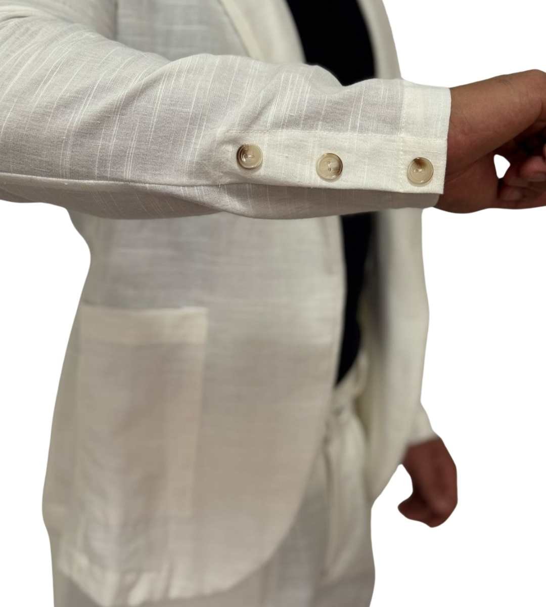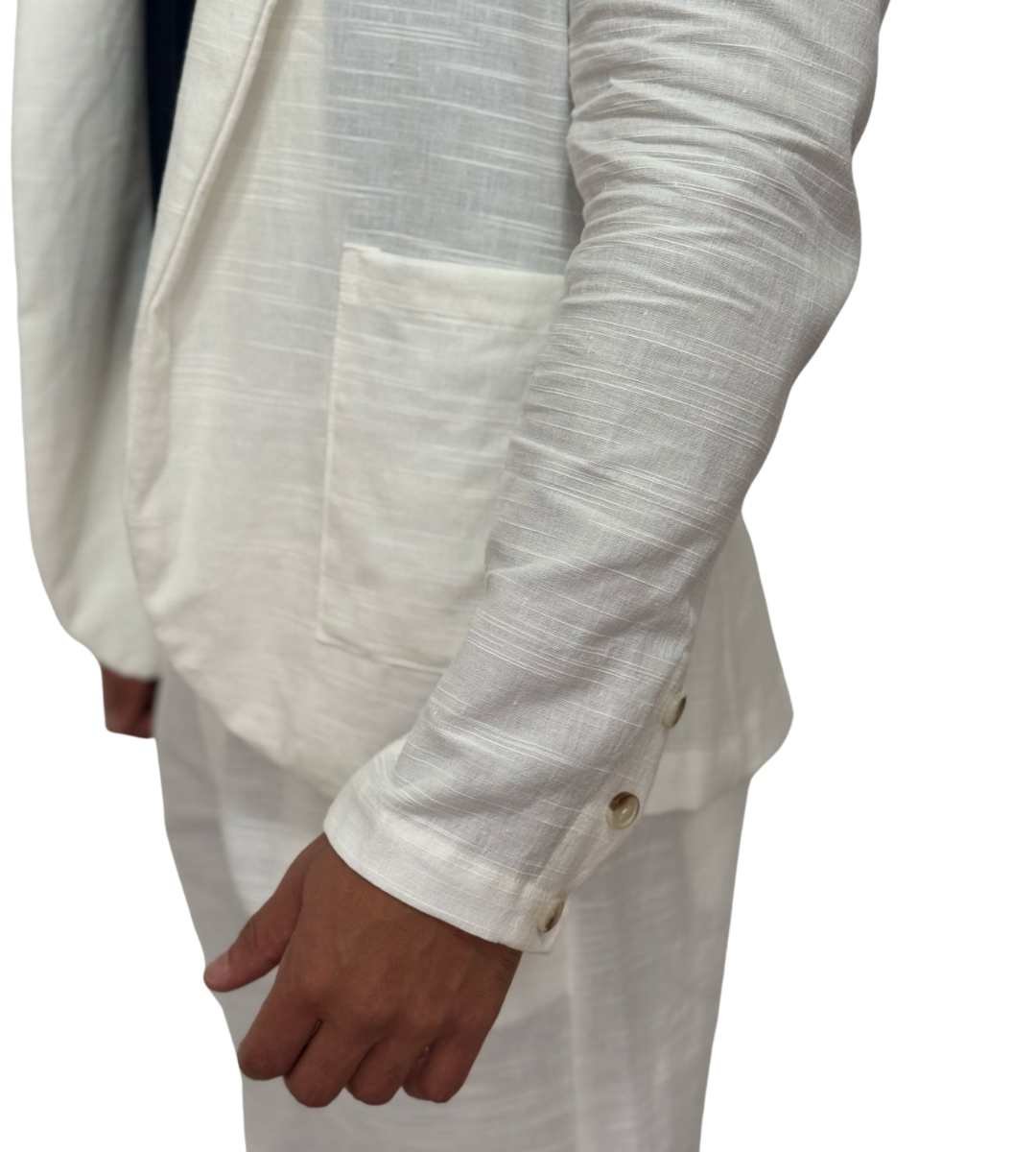 SOBRE A PEÇA: Blazer sem forro, com bolsos frontais sobrepostos. Três botões falsos em cada punho (pode ser caseado se quiser), abertura traseira, revel interno. Sem botão frontal. Acabamento em costura inglesa.