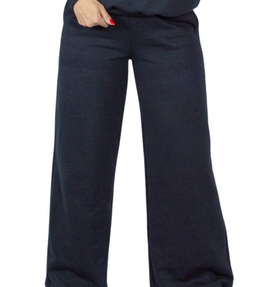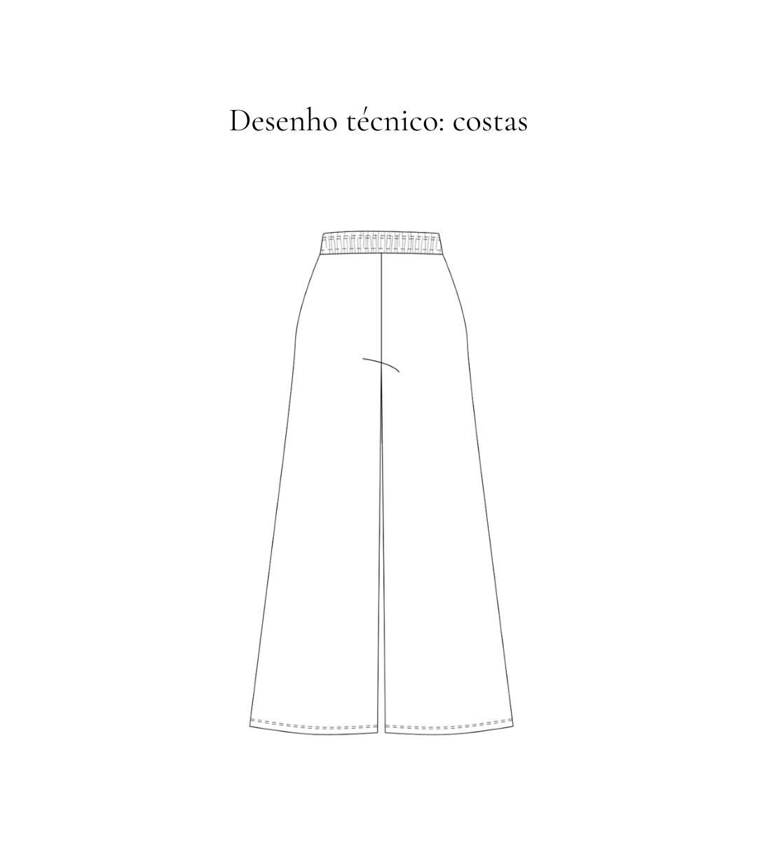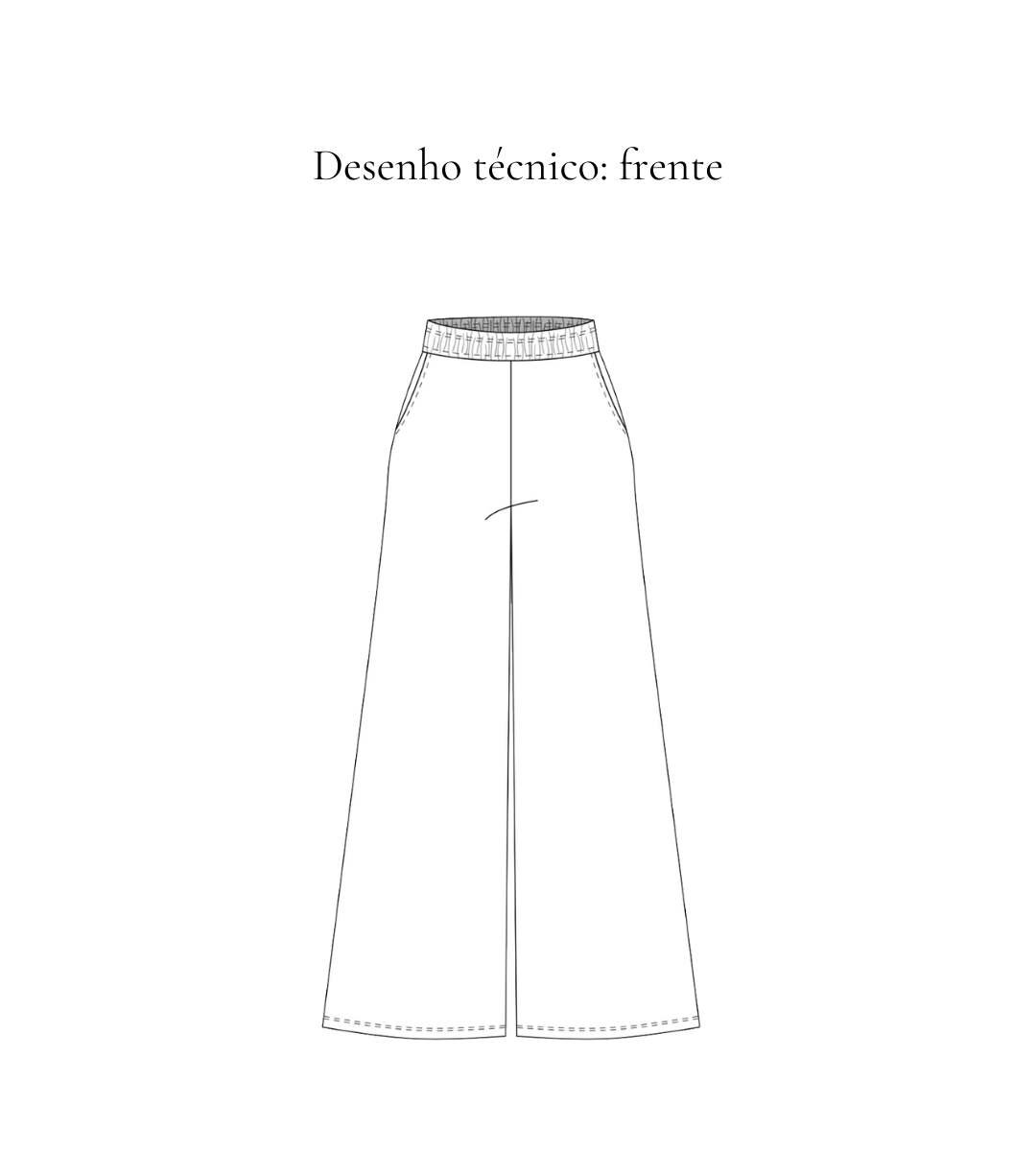 Calça de malha em modelagem pantalona, cintura alta e com cós elástico.