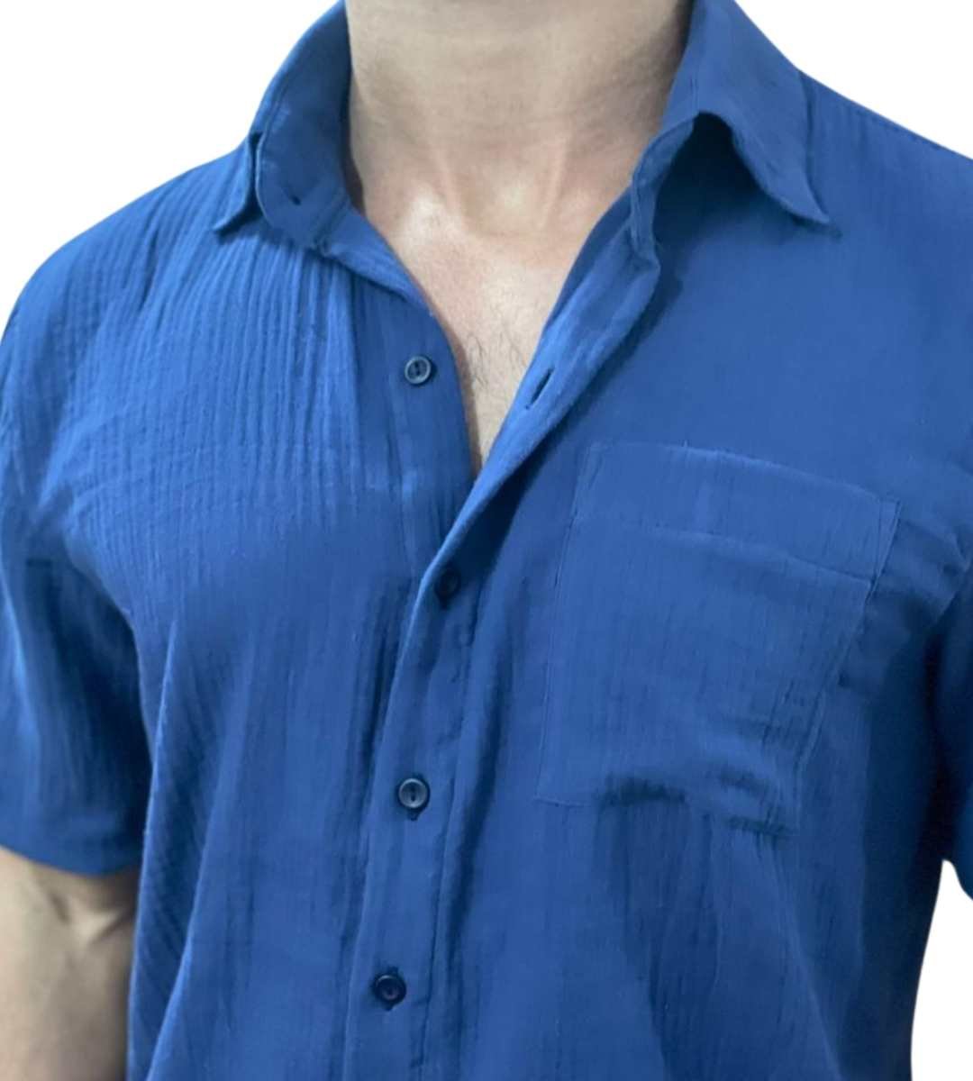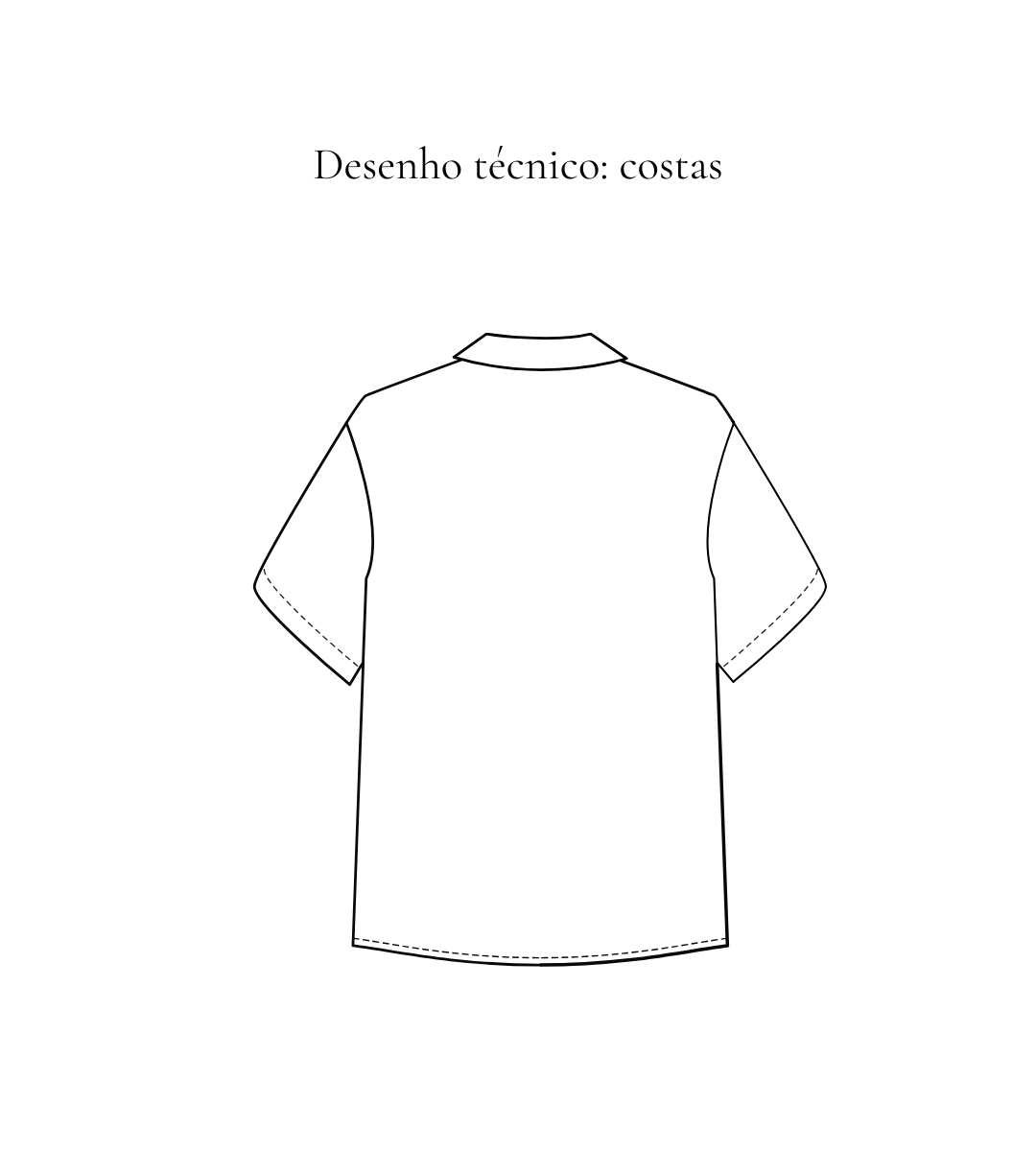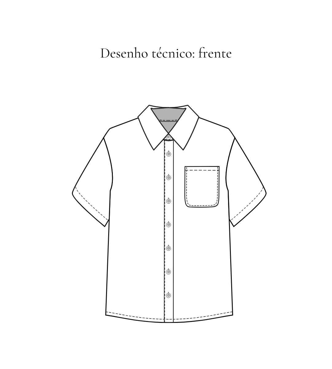 Camisa de manga curta com pé de gola, bolso sobreposto e vista com fechamento frontal em botões caseados. Acabamento na lateral em costura inglesa.