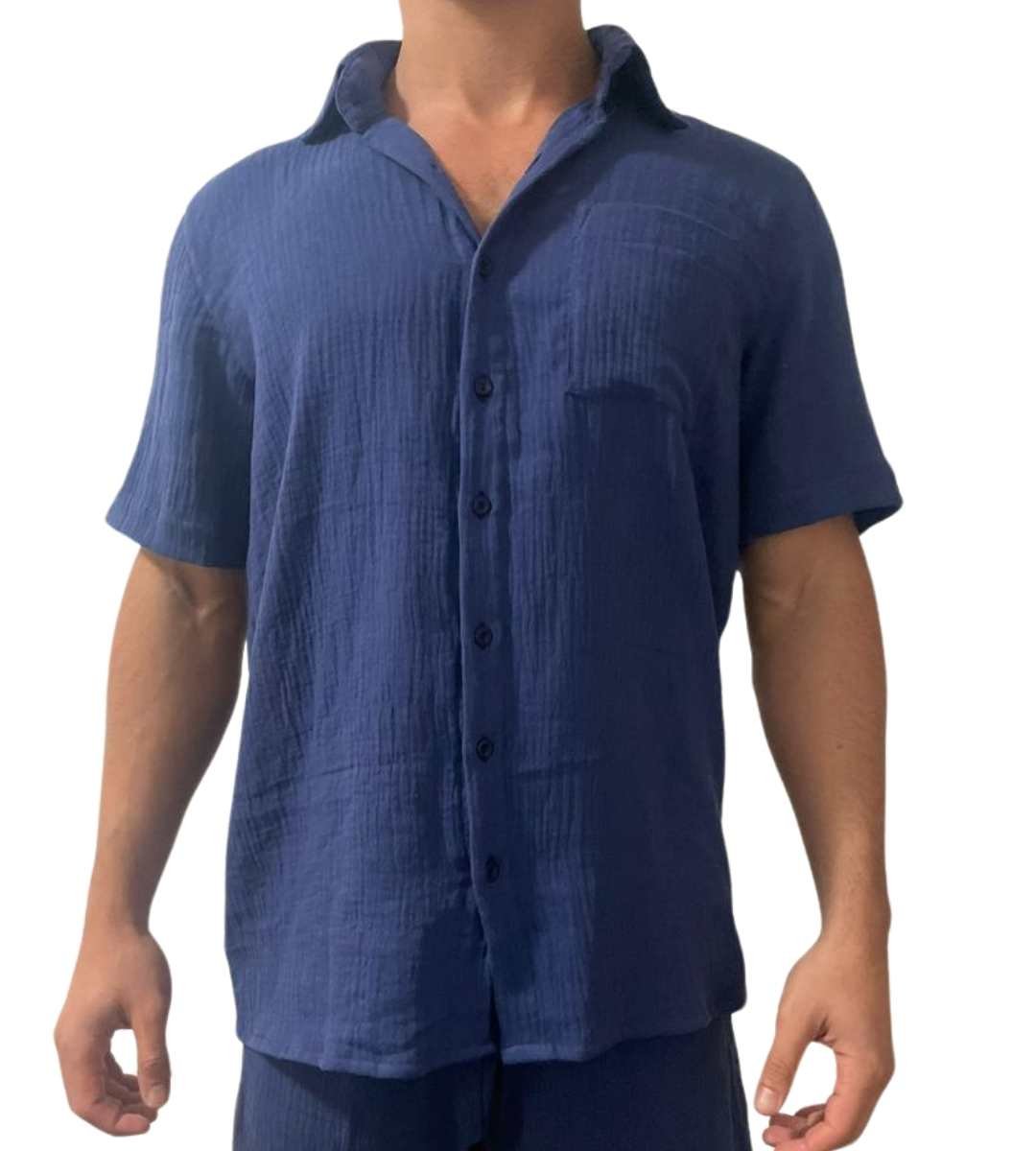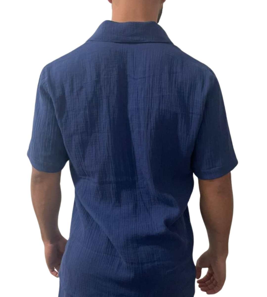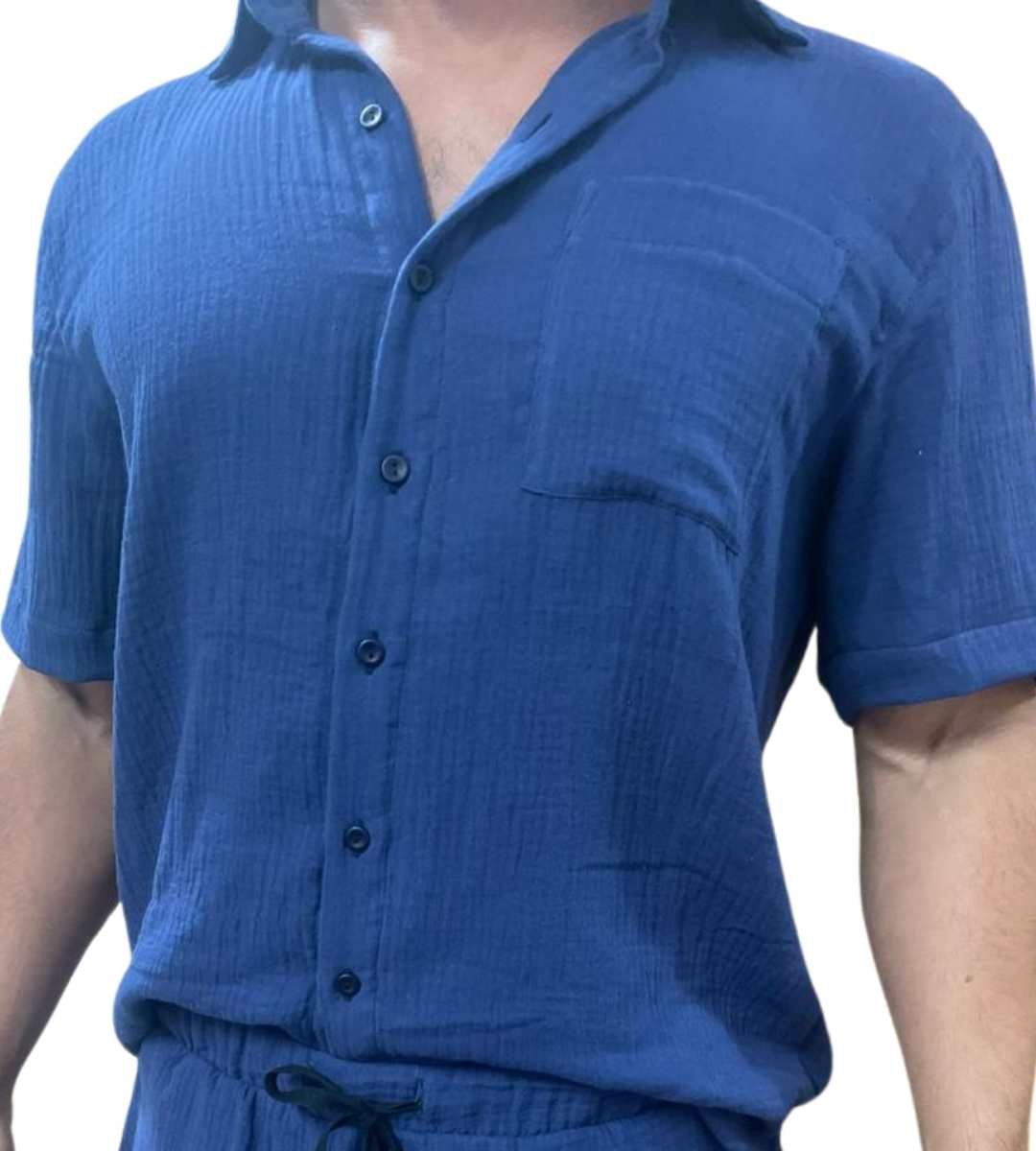 Camisa de manga curta com pé de gola, bolso sobreposto e vista com fechamento frontal em botões caseados. Acabamento na lateral em costura inglesa.