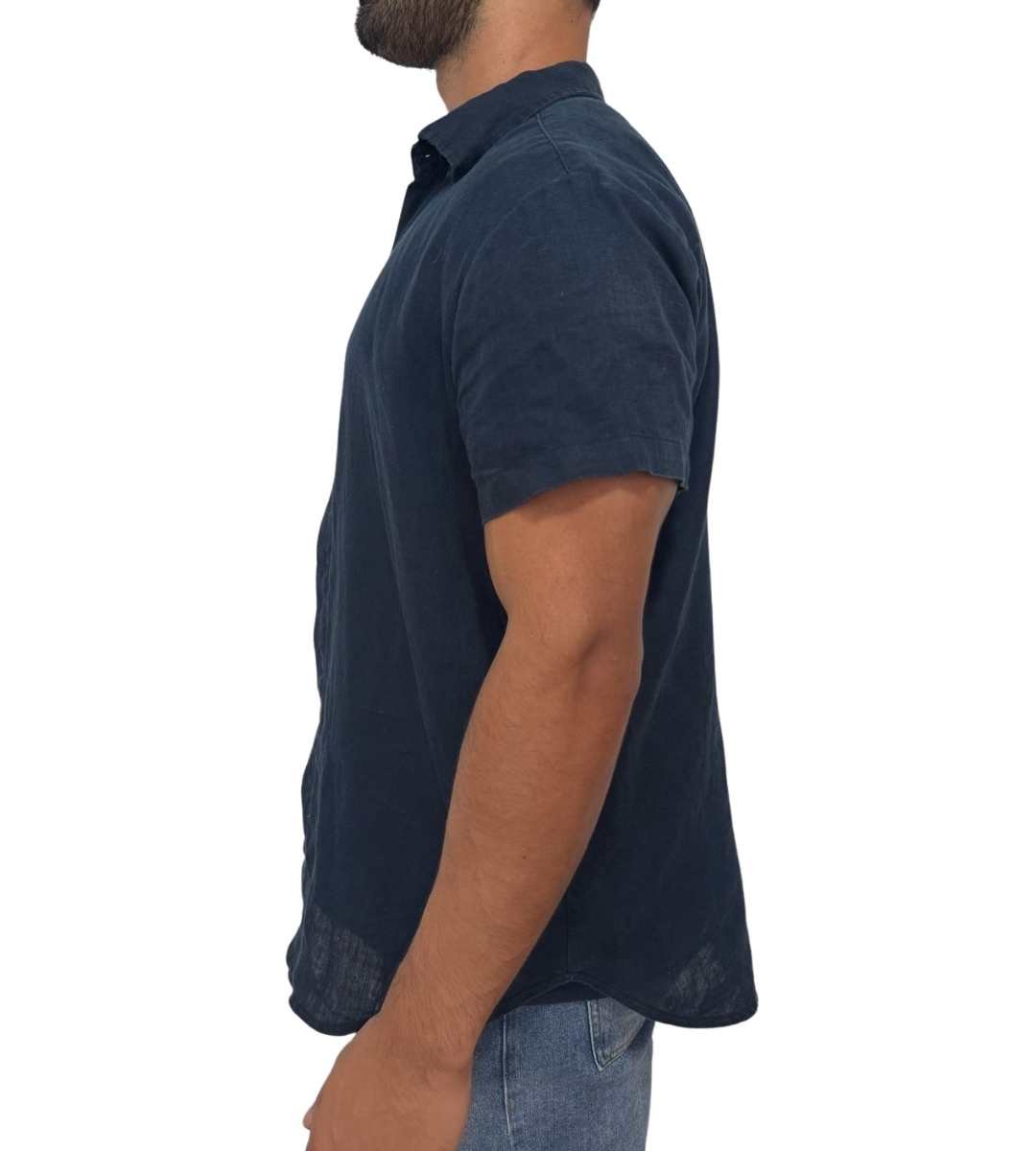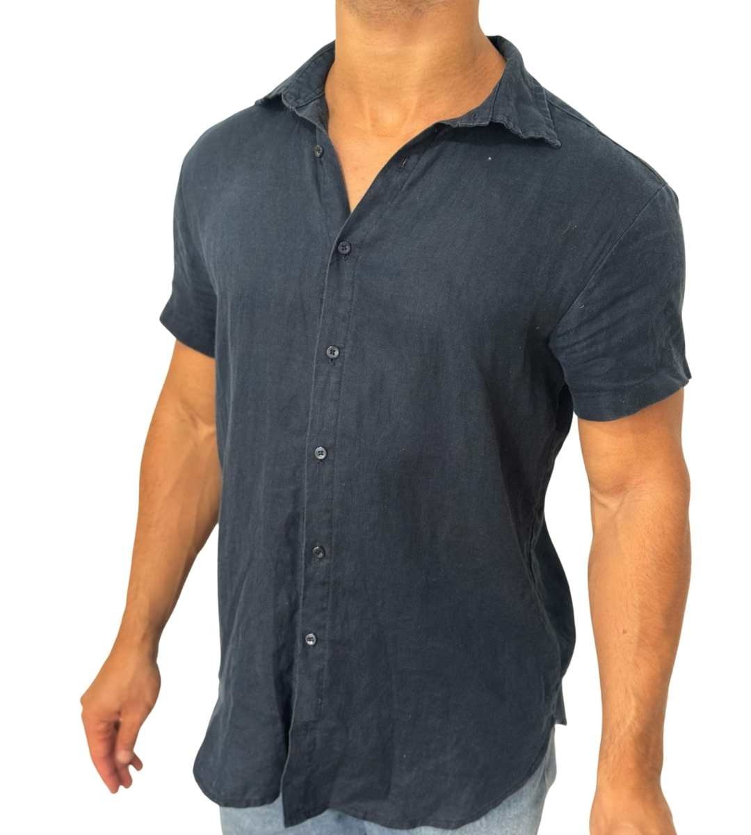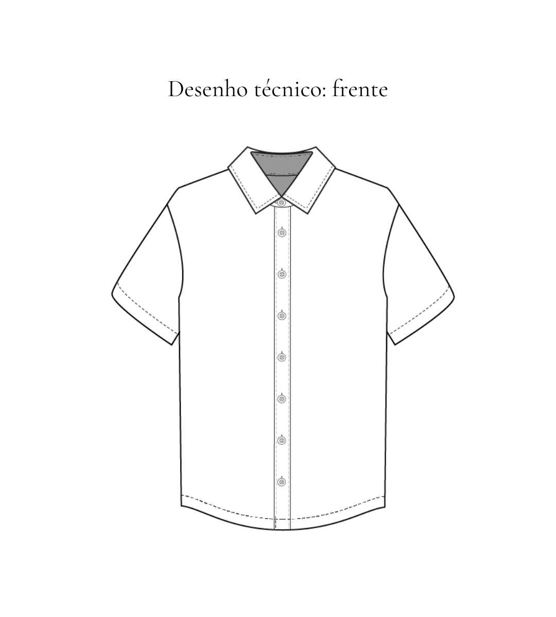 Camisa de manga curta slim, sem bolso sobreposto e vista com fechamento frontal em botões caseados. Acabamento na lateral em costura inglesa.