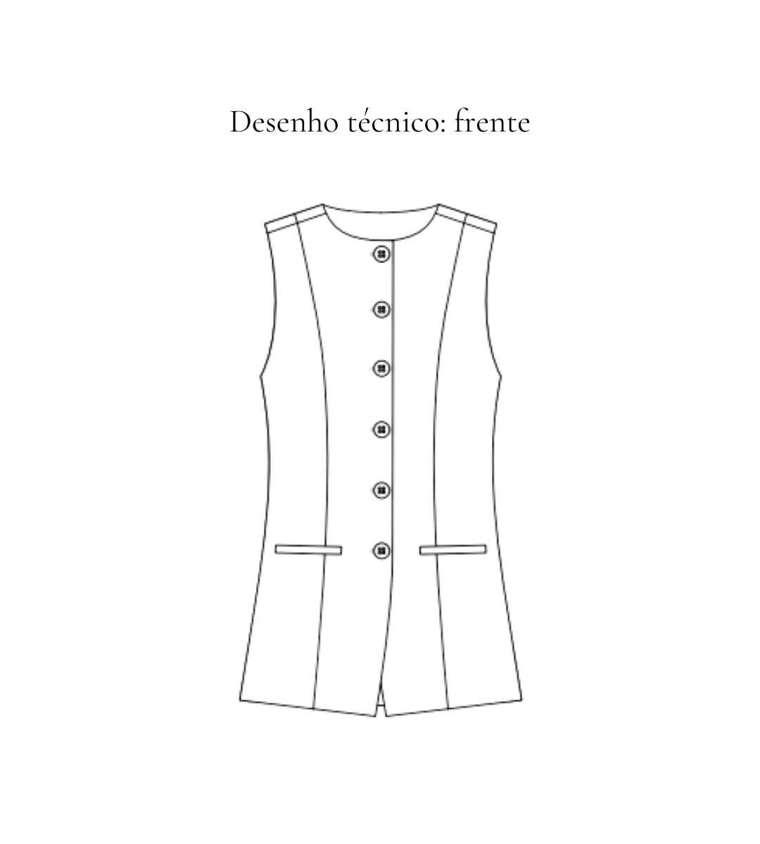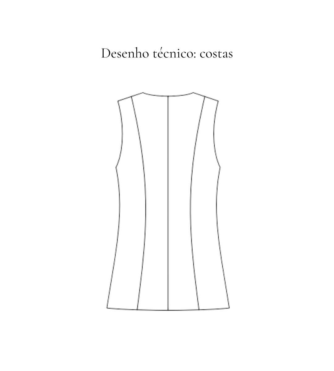 Colete alfaiataria alongado forrado, sem lapela entretelada, fechamento frontal. Bolso de faca frontal. Cinco botões forrados.
