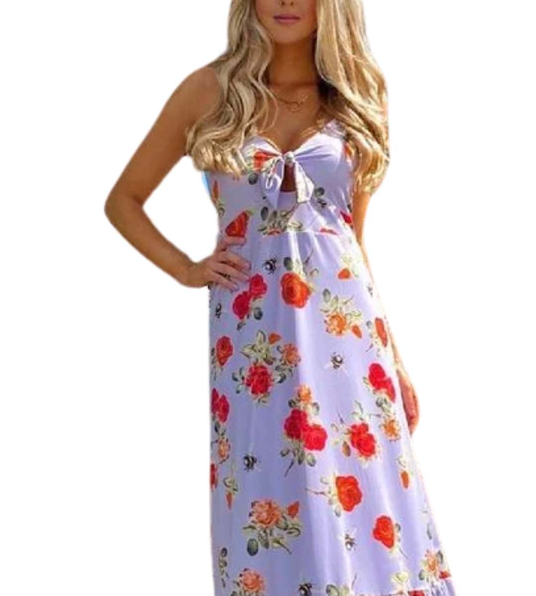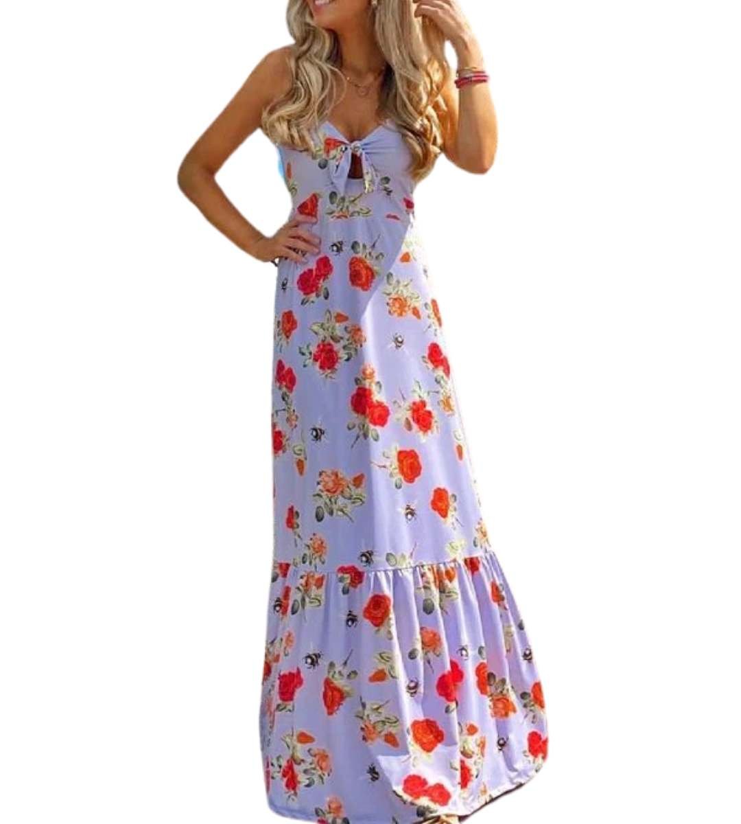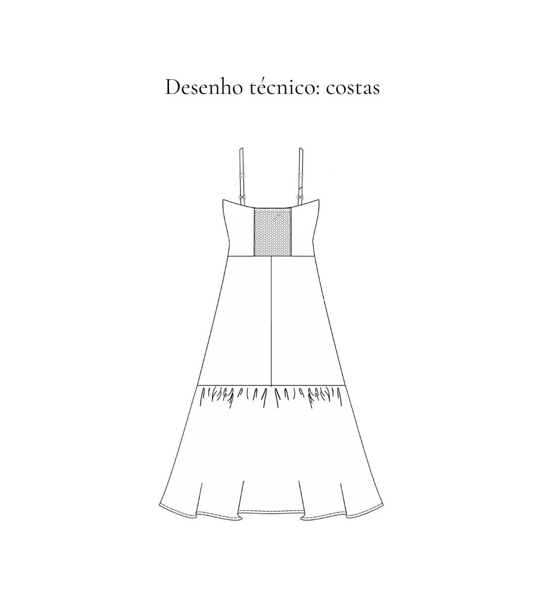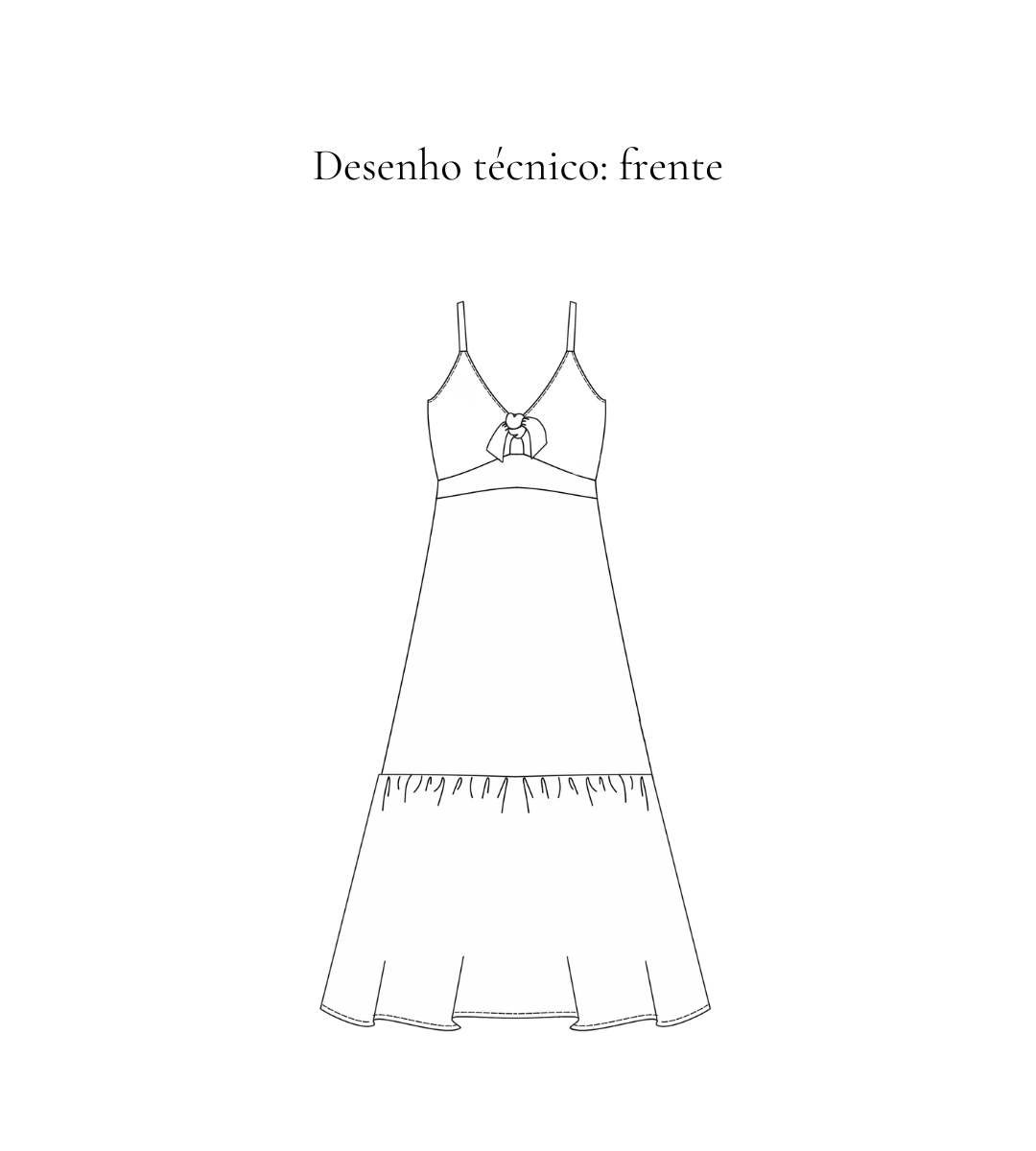 Vestido em malha, longo de alça, com decote, saia três marias. Duplo no busto. Lastex atrás nas costas. Meio forro.